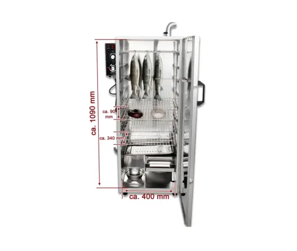 Afumatoarea de carne dispune de o putere electrica de 1000 W si un termostat reglabil pana la 12 ore, facilitand un control avansat al procesului de afumare. Intervalul larg de temperatura, 30 – 135 °C, ofera flexibilitate pentru diferite preparate, de la carne la peste sau branzeturi. Dimensiunile bine gandite si greutatea echilibrata permit amplasarea eficienta in spatii profesionale. Acest echipament profesional asigura un proces rapid si eficient, esential pentru unitatile cu productie mare si diversificata.