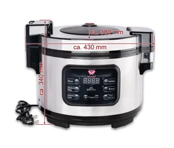 Realizat integral din otel inoxidabil, acest aparat gatit orez este proiectat pentru durabilitate si usurinta in curatare. Materialele de calitate superioara rezista perfect in medii umede si solicitante, asigurand igiena si siguranta alimentara in toate etapele procesului de gatire. Dimensiunile compacte si greutatea redusa permit integrarea usoara in spatii profesionale, fara a afecta fluxul operational.