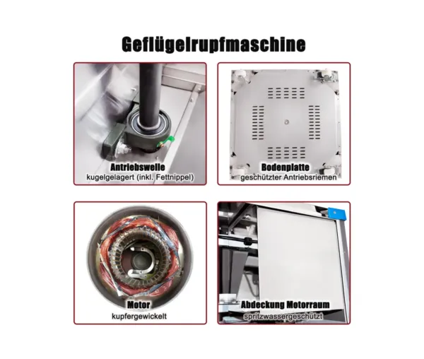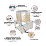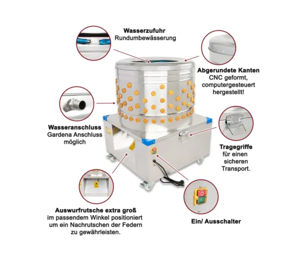 - Jgheabul de evacuare a deșeurilor facilitează curățarea rapidă și eficientă a penelor și a surplusului de apă, menținând deplumatorul curat și gata de utilizare în orice moment.