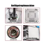 - Aparatul este conceput pentru a prelucra o varietate de păsări, inclusiv pui, rațe, gâște și curcani, fiind capabil să gestioneze păsări cu greutăți de până la 10 kg.