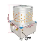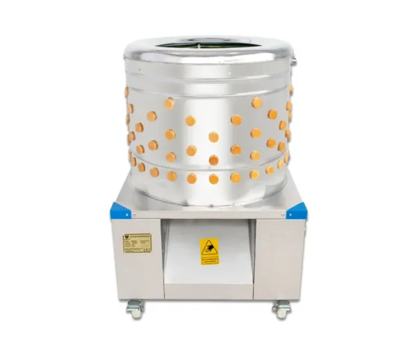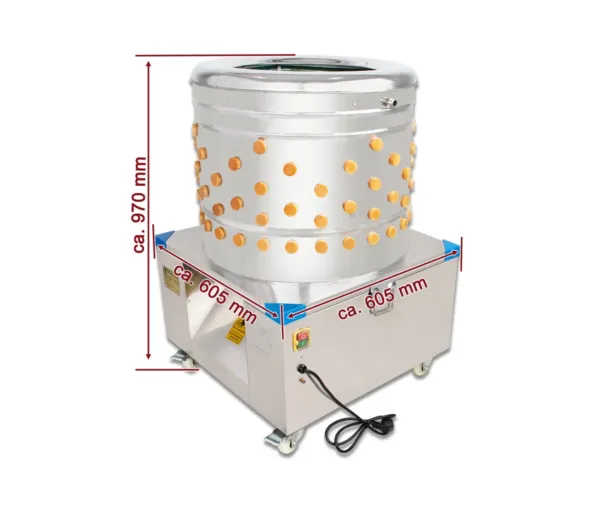 Structura din oțel inoxidabil conferă aparatului rezistență la coroziune și durabilitate pe termen lung, chiar și în condiții de utilizare intensă. Cu dimensiuni exterioare de 620 x 620 x 1070 mm și o greutate de 62 kg, acest deplumator gaini oferă stabilitate în timpul funcționării. Diametrul de 550 mm al tamburului asigură un spațiu suficient de mare pentru a găzdui eficient păsările, facilitând astfel procesarea lor rapidă și uniformă.