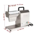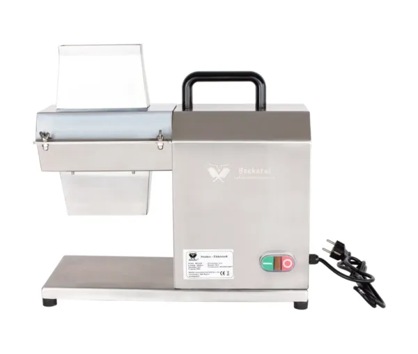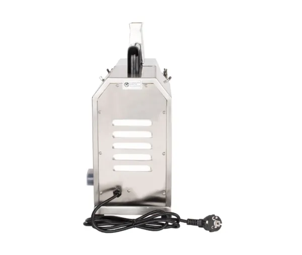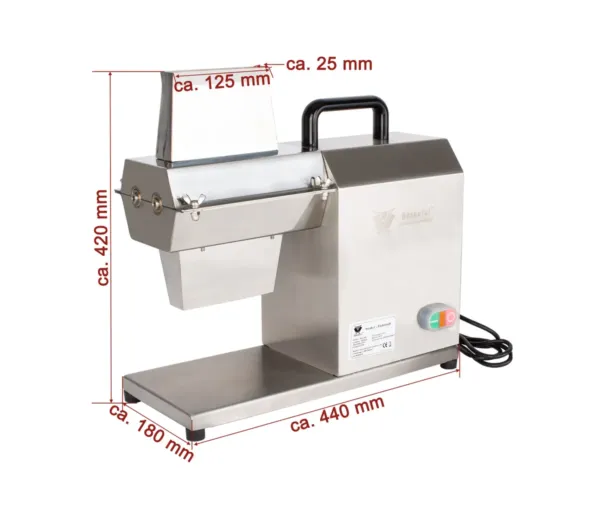 Carcasa și lamele din inox conferă durabilitate și rezistență la coroziune, iar construcția robustă asigură stabilitate chiar și în timpul utilizării intense. Picioarele antiderapante și greutatea aparatului mențin mașina fermă pe blat, oferind siguranță operatorului. Designul compact și ergonomic permite integrarea facilă în orice spațiu de lucru profesional, fie că este vorba despre laboratoare de patiserie, carmangerii sau food trucks.