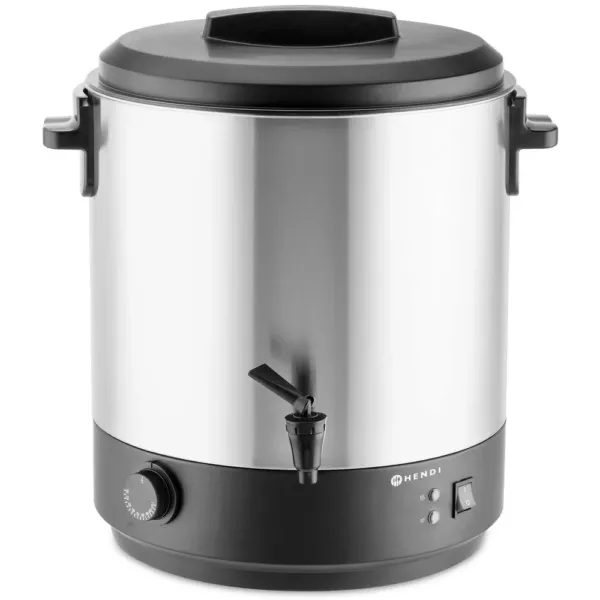 Construit din otel inoxidabil durabil si prevazut cu manere izolate pentru siguranta, acest fierbator vin asigura o incalzire rapida si constanta, fiind echipat cu termostat ajustabil intre 30°C si 110°C. Functia automata de mentinere a temperaturii optimizeaza consumul de energie si faciliteaza prepararea bauturilor calde pe durata intregii zile de lucru. Robinetul non-picurare si capacul cu sistem de blocare „Twist-Lock” asigura o utilizare practica si fara riscuri, adaptata nevoilor profesionale.