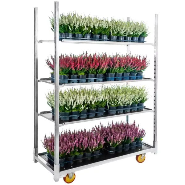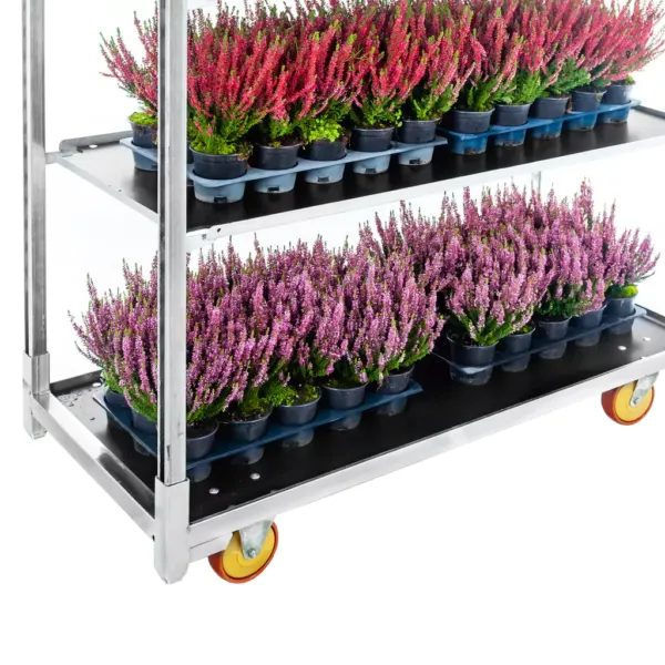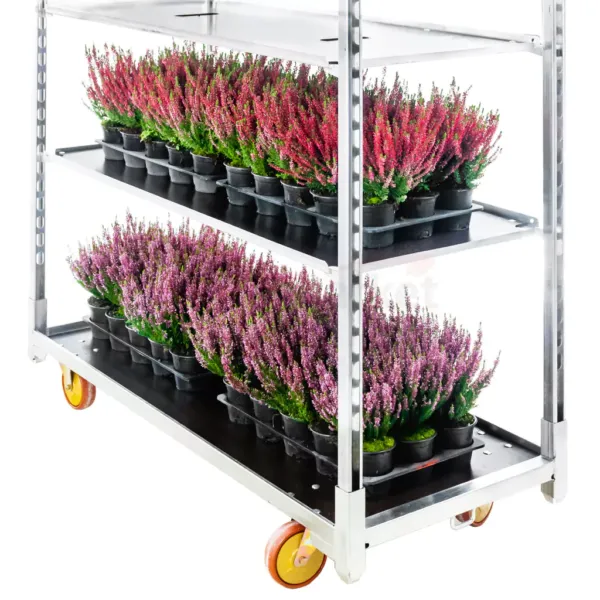 Caruciorul danez pentru flori este un raft pentru flori versatil si eficient, conceput pentru transportul, prezentarea si depozitarea plantelor, florilor taiate si rasadurilor. Este utilizat pe scara larga in sere, florarii, centre de gradinarit si piete horticole, datorita designului sau robust si flexibilitatii in organizare. Acest model include o baza si 2 rafturi ajustabile, oferind spatiu suficient pentru aranjamente florale variate.