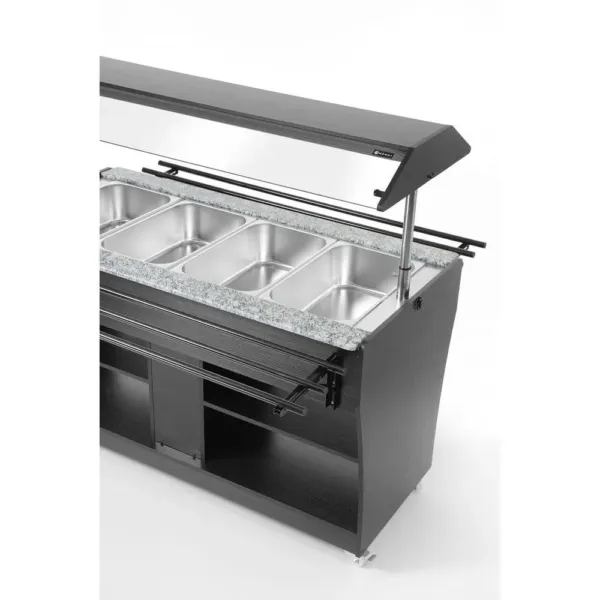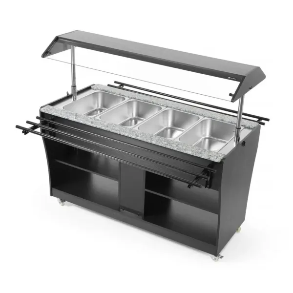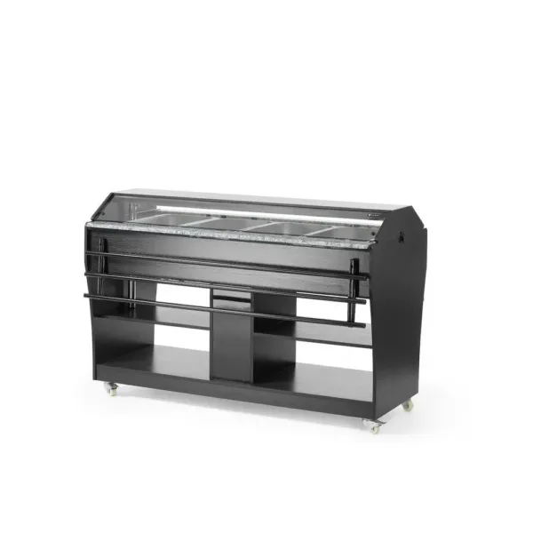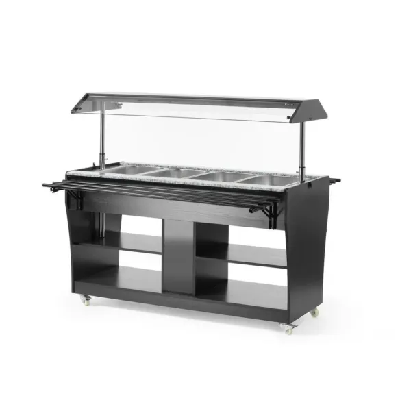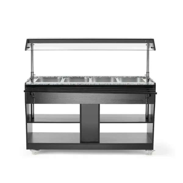 Caruciorul de încălzire este construit din oțel inoxidabil de calitate superioară, cu un finisaj elegant din lemn negru, aducând un aspect modern și profesional. Iluminarea integrată în baldachin adaugă un plus de vizibilitate și stil, iar baldachinul poate fi coborât pentru a acționa ca un capac, protejând preparatele de praf și menținându-le calde pentru o perioadă mai lungă. Ghidajele pliabile pentru tăvi și cele două rafturi sub blat sunt detalii suplimentare care aduc un plus de versatilitate, facilitând depozitarea și manipularea ingredientelor.