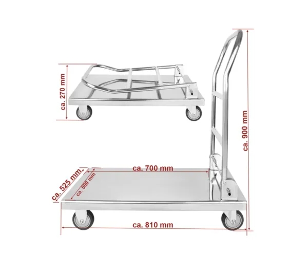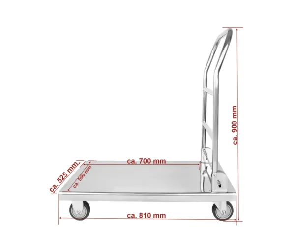 - Dimensiunile totale de 810 x 525 x 900 mm sunt ideale pentru o manevrare ușoară, asigurând în același timp un spațiu generos pentru încărcare și transport.