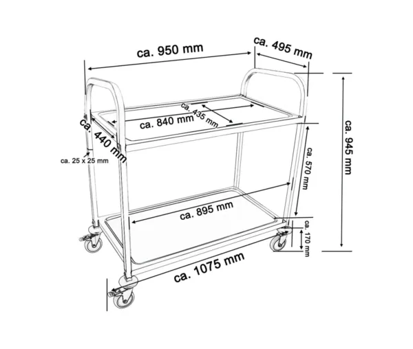 - Capacitate de încărcare de 320 kg – Caruciorul este proiectat pentru a susține până la 320 kg, făcându-l ideal pentru transportul cantităților mari de produse alimentare, ustensile, tăvi sau alte articole utilizate în procesele de servire și aprovizionare.