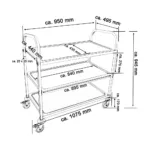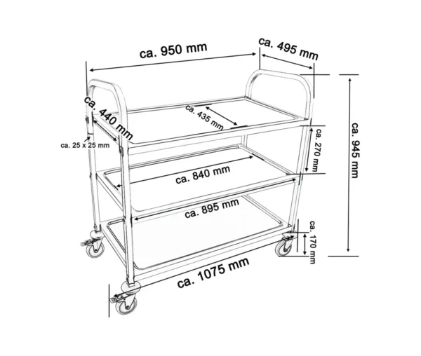 Caruciorul include 3 rafturi largi, special proiectate pentru o capacitate de încărcare impresionantă de 480 kg, permițând transportul simultan al unui volum mare de produse și echipamente. Distanța de 270 mm între nivele asigură spațiu suficient pentru a încărca obiecte voluminoase, făcându-l potrivit atât pentru transportul alimentelor, cât și al echipamentelor și ustensilelor de bucătărie. Dimensiunile de 1070 x 500 x 950 mm oferă un echilibru perfect între capacitatea de transport și compactitatea necesară spațiilor profesionale.