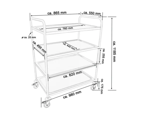 Caruciorul are un cadru tubular rotund și un finisaj neted, oferindu-i un aspect modern și profesional, potrivit pentru toate tipurile de unități HoReCa. Acest design nu doar că asigură o estetică plăcută, dar contribuie și la stabilitatea generală a caruciorului, făcându-l ideal pentru sarcini intensive de transport și depozitare.