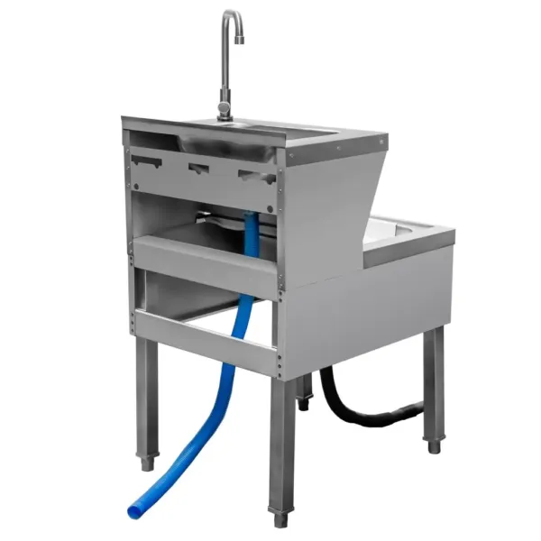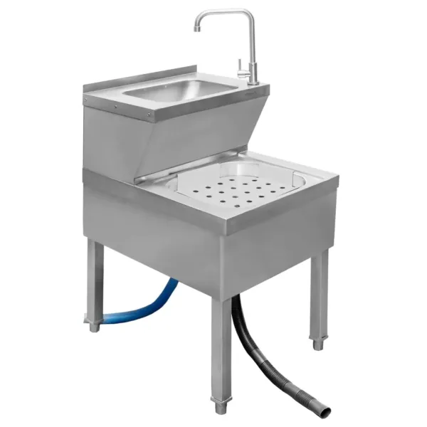 Acest spalator de maini profesional este echipat cu doua cuve si un sistem de scurgere optimizat, permitand spalarea rapida a echipamentelor, vaselor sau mopurilor, fara riscul de stropire si fara pierderi de timp. Designul functional include un rant inalt care previne revărsarea apei, asigurand un spatiu de lucru curat si ordonat.