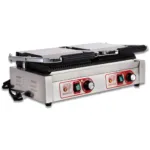 Grătarul electric profesional cu suprafață combinată – partea superioară striată și partea inferioară netedă – permite obținerea unor preparate cu texturi variate, perfecte pentru panini, sandvișuri, carne și legume. Controlul precis al temperaturii până la 300°C asigură o gătire uniformă, iar materialele durabile precum fonta cu înveliș ceramic și carcasa din oțel inoxidabil oferă rezistență și ușurință în curățare.