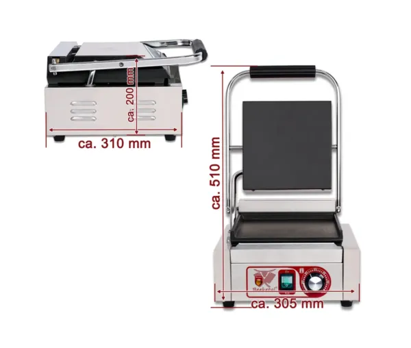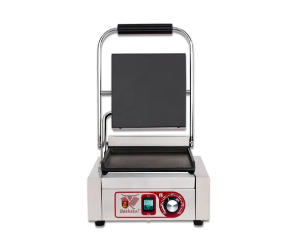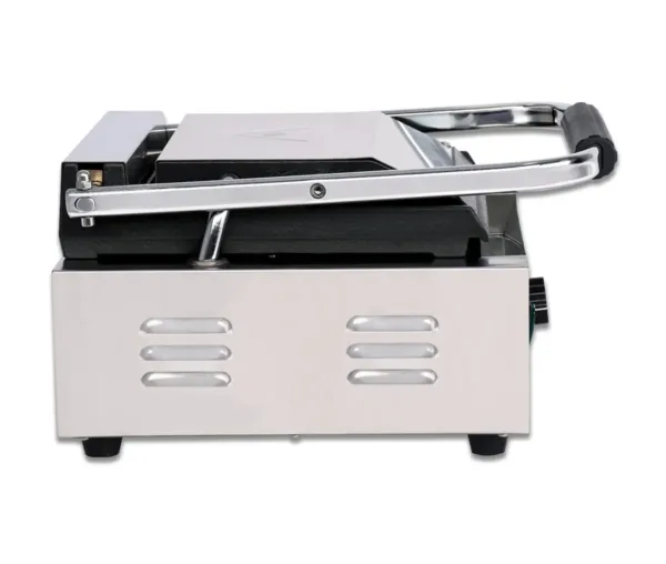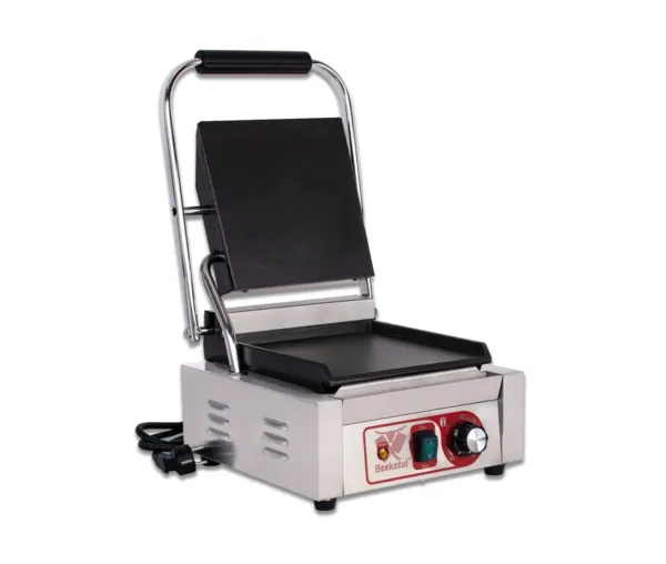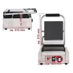 Contact grill panini simplu cu placă netedă face parte din gama de echipamente profesionale pentru restaurante, fast-food și cafenele, fiind esențial pentru prepararea rapidă și uniformă a panini-urilor, sandwich-urilor și altor preparate grill. Designul compact și performanța ridicată îl fac ideal pentru spații restrânse, fără a compromite calitatea rezultatelor.