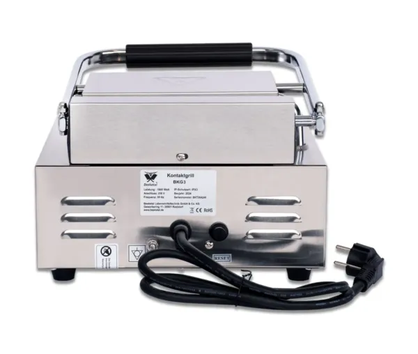 Cu o putere de 1800 W și suprafață de lucru de 230 x 250 mm, acest grill panini permite prepararea rapidă a mai multor porții simultan. Termostatul reglabil continuu până la 300 °C asigură control complet asupra procesului de gătire, iar lumina de avertizare indică momentul în care aparatul este gata de utilizare. Astfel, fiecare preparat este uniform și de calitate profesională.