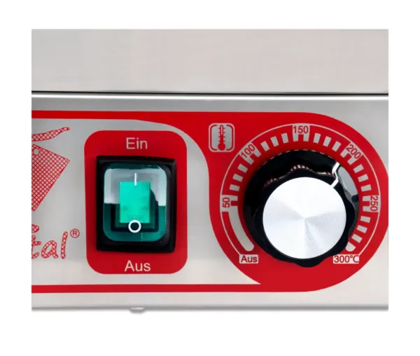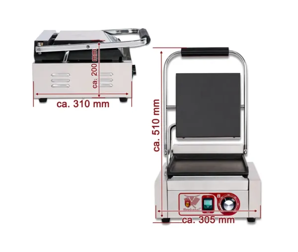 Echipat cu termostat reglabil și lumini de avertizare, acest contact grill permite ajustarea temperaturii până la 300 °C, oferind control complet asupra procesului de gătire. Indiferent dacă prepari panini, legume sau carne, aparatul asigură coacere uniformă și rezultate de calitate profesională.