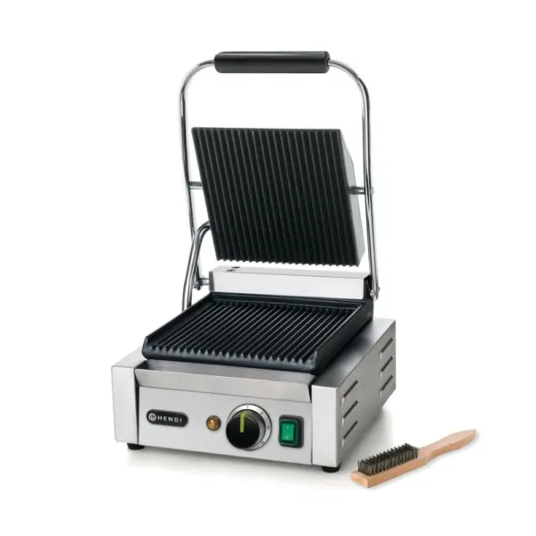 Contact grill-ul simplu striat dispune de o suprafață de gătit optimă pentru porții medii și include o placă inferioară cu fanta specială pentru scurgerea grăsimii, asigurând preparate mai sănătoase. Carcasa robustă din inox asigură longevitate, iar accesoriul de curățare inclus facilitează întreținerea zilnică.