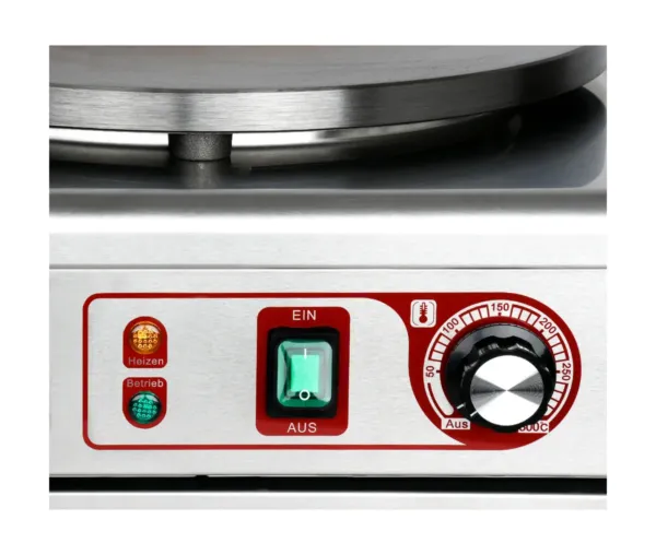 Dotat cu distribuitor de aluat din lemn si spatula, aparatul faciliteaza prepararea rapida si organizata a clatitelor. Operarea este intuitiva, iar indicatorii luminosi semnaleaza starea aparatului, oferind un flux de lucru sigur si eficient. Curatarea este simpla datorita designului ergonomic si tehnologiei robuste.