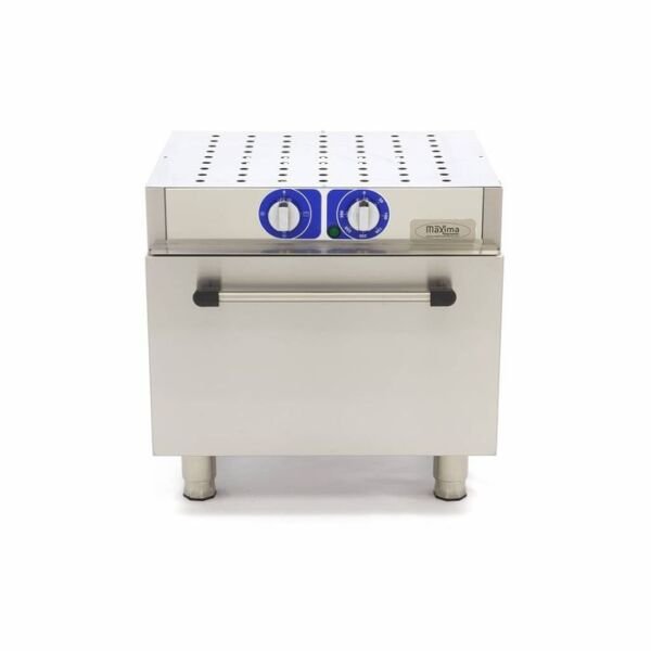 Temperatura poate fi ajustata cu ajutorul unui termostat analogic, intre 50 si 300°C, permitand prepararea diverselor tipuri de produse – de la carne si legume, pana la aluaturi, patiserie sau produse semipreparate. Camera interioara din inox dispune de ghidaje pentru 3 tavi GN 1/1, ceea ce ofera o capacitate generoasa pentru productie continua in regim profesional.