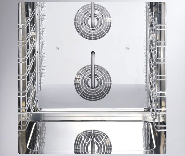Cuptorul este echipat cu 2 ventilatoare centrifugale cu funcție de auto-revers, care asigură o distribuție uniformă a căldurii în întreaga cameră de coacere. Aceste ventilatoare elimină punctele fierbinți și asigură că produsele sunt coapte uniform, indiferent de poziționarea tăvilor. Această caracteristică este esențială pentru patiseriile și cofetăriile care doresc rezultate constante la fiecare ciclu de coacere.