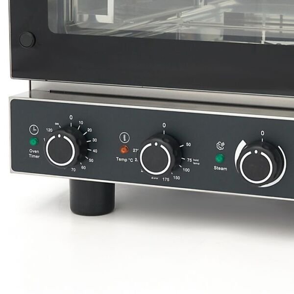 Cuptorul patiserie cu aburi oferă control analogic intuitiv, permițând reglarea temperaturii între 50°C și 270°C și ajustarea nivelului de abur între 0% și 100%. Ventilația cu funcție reversibilă asigură o distribuție uniformă a căldurii, ceea ce garantează coacerea perfectă a produselor de patiserie, a pâinii sau a preparatelor gratinate.