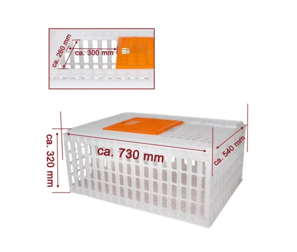 Asigurați un transport sigur și confortabil pentru pasările dumneavoastră cu Cutia de Transport pentru Pasări. Proiectată cu atenție, această cutie oferă un mediu optim pentru păsările de curte și animalele mici, fiind esențială pentru fermele de păsări și carmangeriile care necesită un echipament de calitate.