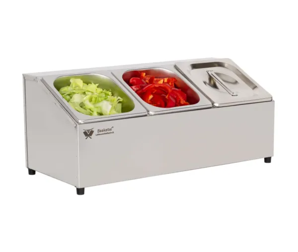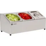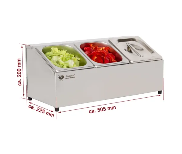 Fiecare dintre cele trei cuve GN 1/6 are o capacitate de 1,6 litri, perfectă pentru stocarea și separarea ingredientelor sau preparatelor. Această configurație permite organizarea eficientă a ingredientelor în bucătărie, facilitând accesul rapid și ordonat la ingredientele necesare. - Dimensiuni compacte, compatibile cu spațiile de lucru profesionale
