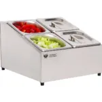 Setul de cuve inox pentru ingrediente 4GN 1/6 este conceput pentru profesioniștii din industria HoReCa, oferind o soluție de depozitare eficientă, durabilă și ușor de organizat pentru ingredientele esențiale. Fabricat din oțel inoxidabil rezistent la coroziune, acest set de cuve este optimizat pentru o utilizare intensivă în bucătării profesionale, laboratoare de cofetărie, pizzerii, fast-food-uri și alte unități HoReCa. Materialul inoxidabil asigură durabilitate pe termen lung și îndeplinește cele mai înalte standarde de igienă.