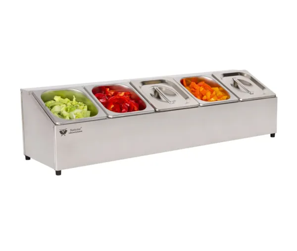 Fiecare cuvă GN 1/6 are o capacitate de 1,6 litri, permițând separarea și stocarea eficientă a diverselor ingrediente. Acest aranjament este ideal pentru bucătării care necesită organizare strictă, oferind un acces rapid și ordonat la materialele necesare în procesele de preparare. - Design versatil, adaptabil pentru orice spațiu