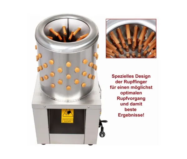 - Performanță înaltă: Deplumatorul asigură o jumulire uniformă datorită celor 117 degete din cauciuc, care minimizează deteriorarea cărnii. Este recomandabil să se proceseze câte o singură pasăre pe ciclu, pentru a obține cele mai bune rezultate. În cazul procesării mai multor păsări simultan, se recomandă îndepărtarea ghiarelor pentru a evita zgârieturile.
