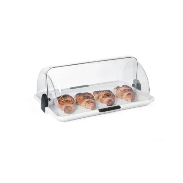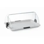 Din categoria vitrina neutra orizontala, acest model este prevazut cu un capac tip roll top fabricat din plastic SAN transparent, care permite acces rapid si vizibilitate perfecta asupra continutului. Ideal pentru expunerea produselor precum gustari ambalate, croissante, briose sau chifle, capacul culisant protejeaza alimentele impotriva prafului si contaminarii, fara a compromite accesibilitatea.