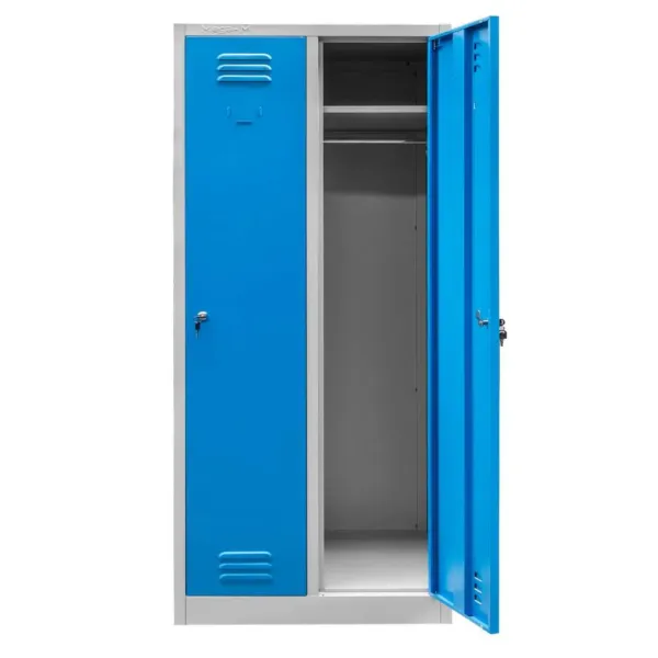 Acest dulap ofera organizare practica prin cele doua compartimente independente, fiecare echipata cu polita, draperie pentru umerase si suport pentru accesorii. Ventilatia inteligenta prin fante speciale asigura circulatia aerului, prevenind acumularea umezelii si mirosurilor neplacute. Designul modern, cu front albastru si corp gri, adauga un plus de profesionalism si se integreaza in orice spatiu.