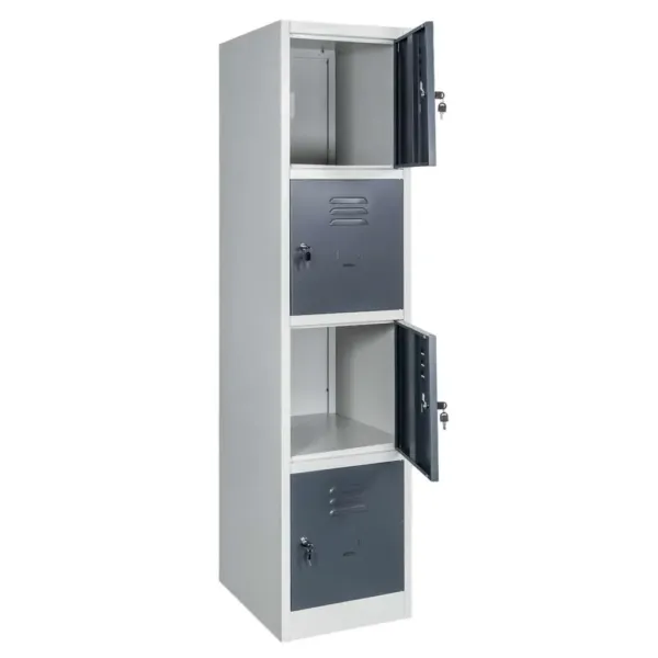 Acest Dulap BHP cu compartimente dispune de patru compartimente independente, fiecare prevăzută cu vizitieră pentru identificare și orificii de ventilație pentru aerisire optimă. Compartimentarea inteligentă permite utilizarea eficientă a spațiului și menținerea ordinii, fiind ideală pentru mai mulți utilizatori care au nevoie de siguranță și confidențialitate pentru obiectele personale.