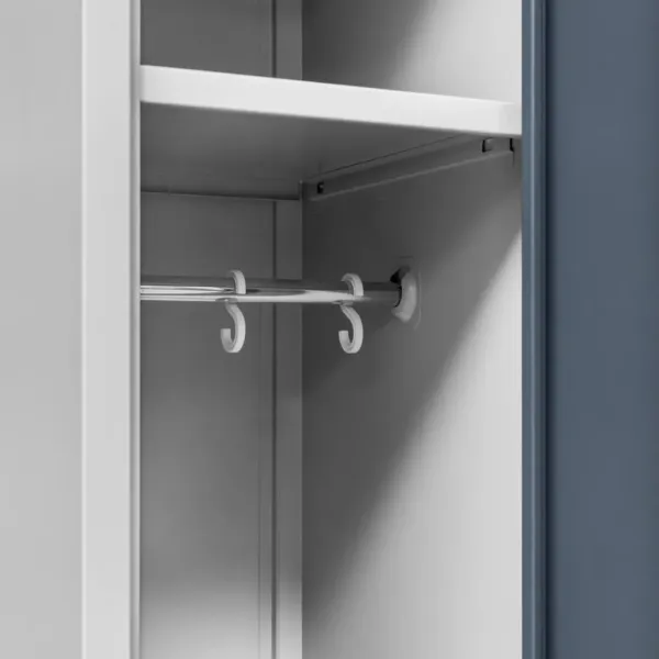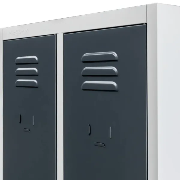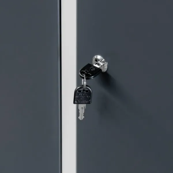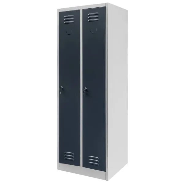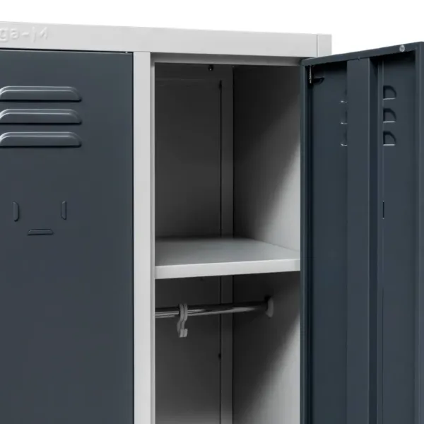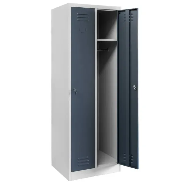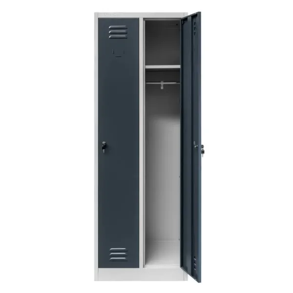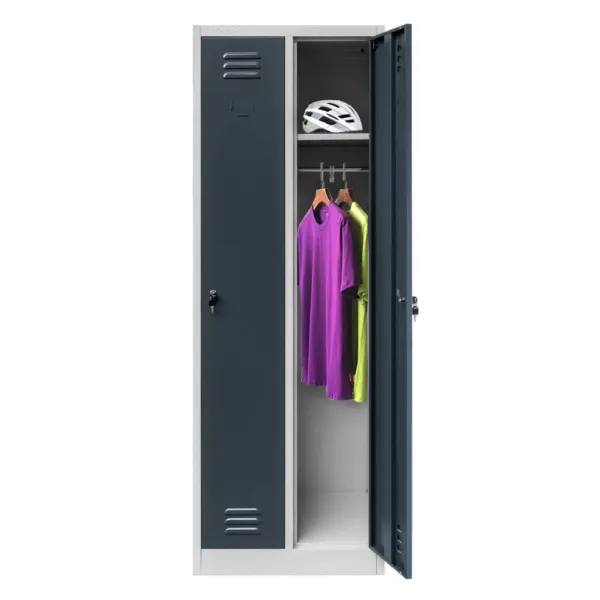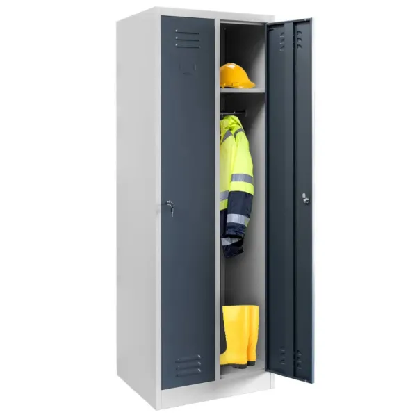 Acest dulap ofera doua compartimente independente, fiecare echipata cu polita si bara cu carlige, pentru o organizare eficienta a hainelor si accesoriilor. Ventilatia incorporata prin fante speciale asigura circulatia aerului si previne acumularea umiditatii, mentinand hainele curate si uscate. Designul modern si combinatia de gri cu grafit creeaza un aspect profesional si elegant in orice spatiu de lucru.
