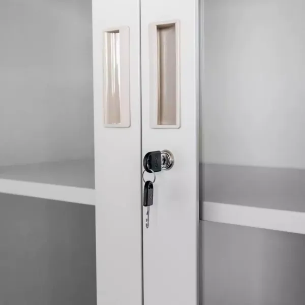 Unul dintre cele mai importante aspecte ale acestui model este sistemul de inchidere cu cheie, care protejeaza documentele si obiectele personale impotriva accesului neautorizat. Fabricat din tabla de otel de 0,6 mm, dulapul este rezistent la impact, zgarieturi si umezeala, asigurand utilizare indelungata fara deteriorare.