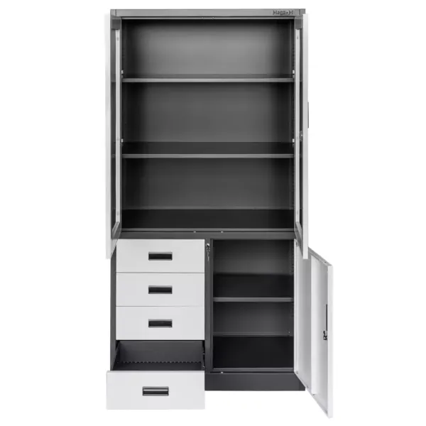 Un dulap birou de calitate este esential pentru organizarea eficienta si sigura a documentelor si obiectelor importante. Modelul cu 4 sertare, usi vitrate si compartiment inchis este ideal pentru birouri, arhive, laboratoare, clinici medicale, biblioteci si unitati comerciale, oferind acces facil si protectie sporita.
