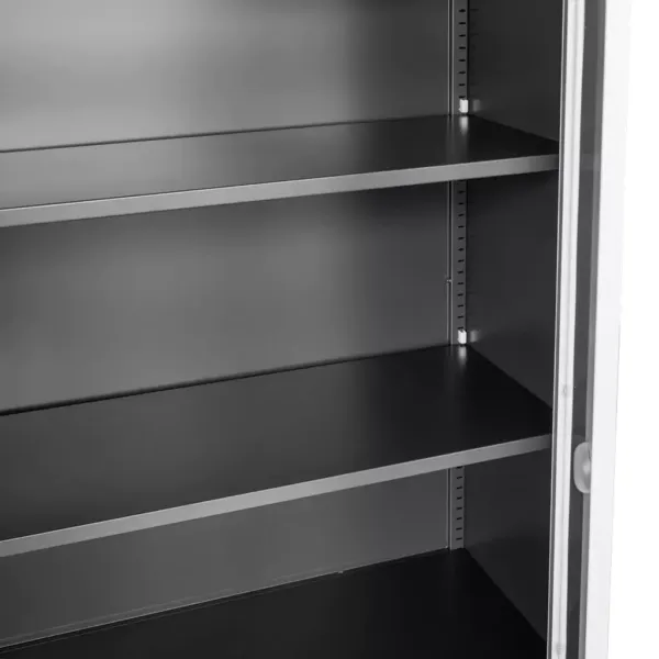 Fabricat din tabla de otel vopsita electrostatic, acest dulap birou este rezistent la coroziune, praf si impact mecanic, avand o durata lunga de utilizare si fiind usor de curatat.