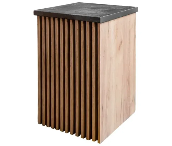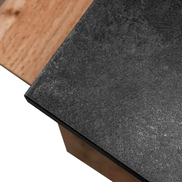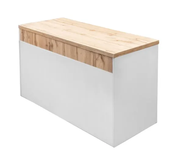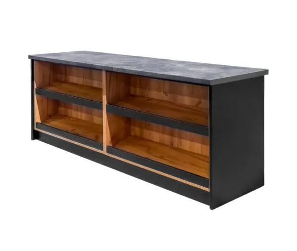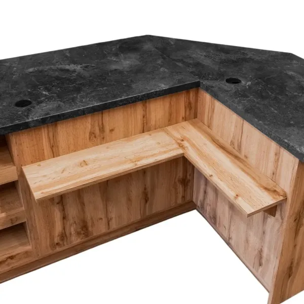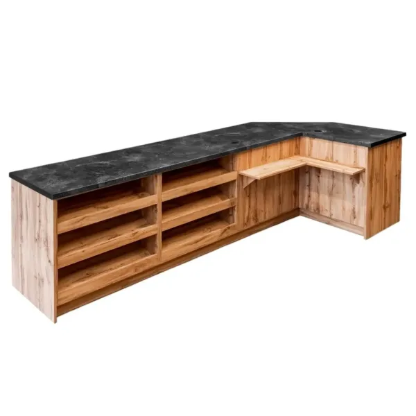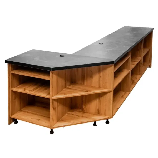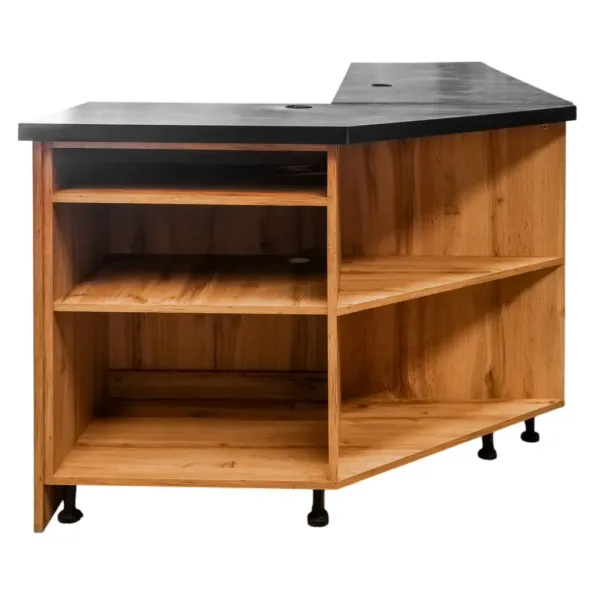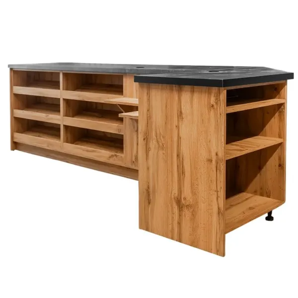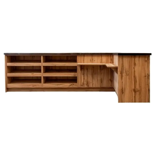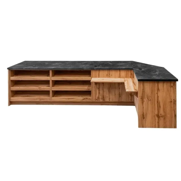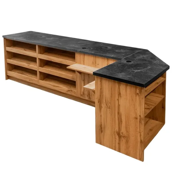 Construcția din placă de mobilier laminată de 18 mm și blat de 36 mm conferă rezistență sporită la uzură, asigurând durabilitate pe termen lung. Suprafața finisată elegant în stejar wotan și negru oferă un aspect modern și profesional, ușor de integrat în orice design interior al spațiului comercial.