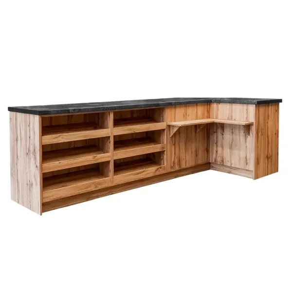 Dulapul include rafturi și compartimente ergonomice, permițând organizarea eficientă a produselor și acces facil pentru clienți. Forma în L și spațiile special concepute pentru ștergerea și gestionarea produselor contribuie la un mediu de lucru ordonat și profesional, potrivit pentru orice tip de punct comercial.