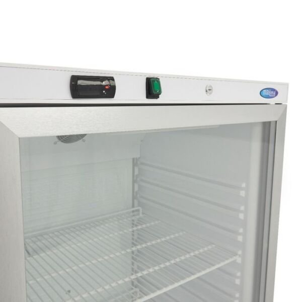 Cu un design modern si finisaj alb, acest frigider profesional se integreaza armonios in orice spatiu de lucru. Usa din sticla securizata permite personalului sa identifice rapid produsele depozitate, reducand frecventa deschiderii si pastrand temperatura constanta in interior. Sistemul de inchidere cu cheie sporeste siguranta, iar garnitura antibacteriana detasabila faciliteaza curatarea si mentinerea igienei.