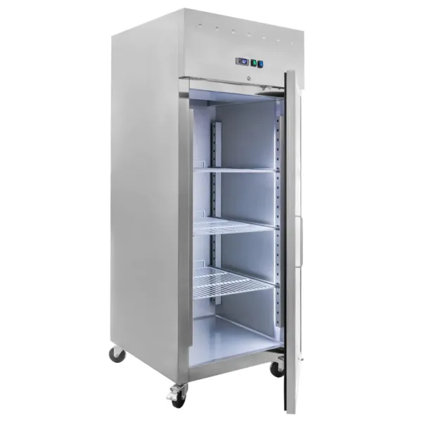 Cu o capacitate generoasa de 685 litri, acest frigider inox este ideal pentru pastrarea in siguranta a alimentelor. Cele 3 rafturi reglabile optimizeaza spatiul de depozitare, iar dimensiunile de 74x84x199 cm il fac potrivit pentru orice bucatarie profesionala sau magazin alimentar.