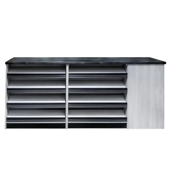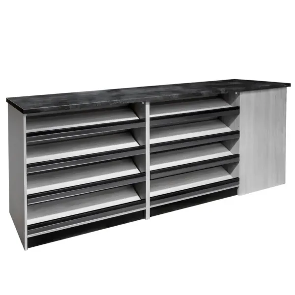 Folosirea acestui dulap magazin crește eficiența spațiului comercial și îmbunătățește experiența clienților. Blatul rezistent și compartimentele bine gândite permit expunerea și depozitarea facilă a produselor, în timp ce designul modern asigură durabilitate și ușurință în întreținere, potrivit pentru puncte cu trafic intens.