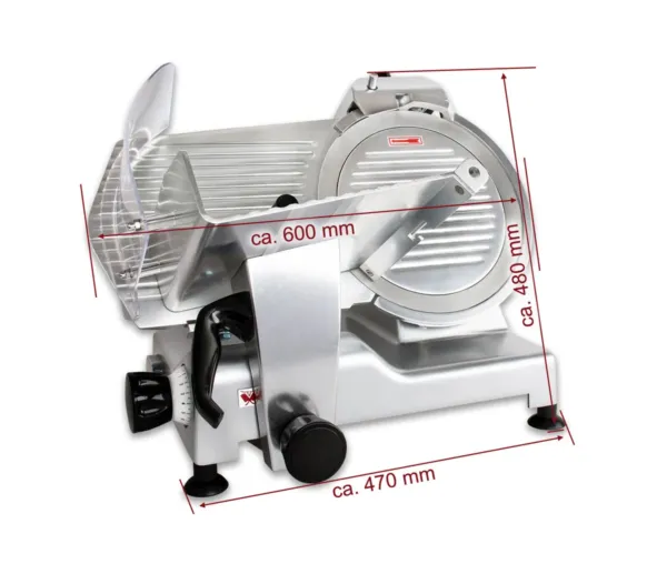Cu dimensiuni compacte de 600 x 500 x 460 mm și o greutate de 24 kg, acest feliator este conceput pentru a economisi spațiu și a facilita integrarea sa în orice bucătărie profesională. Feliatorul de mezeluri este ușor de manevrat și întreținut, datorită structurii din aluminiu anodizat, care permite o curățare rapidă și igienică, prevenind acumularea resturilor alimentare.