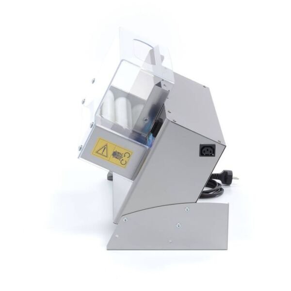 Construit integral din inox, aparatul este prevăzut cu un capac protector transparent și un întrerupător de siguranță care oprește funcționarea în caz de manipulare incorectă. Baza stabilă din inox oferă aderență optimă pe blaturile de lucru. Designul robust și finisajele premium îl fac potrivit pentru utilizarea zilnică în medii profesionale solicitante.