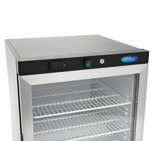 Frigiderul este echipat cu 3 rafturi reglabile care permit configurarea optima a spatiului interior. Acestea creeaza pana la 4 compartimente, adaptabile oricarui tip de produs. Usa cu geam securizat si incuietoare permite vizualizarea continutului fara a compromite temperatura din interior, ceea ce contribuie la reducerea consumului energetic.