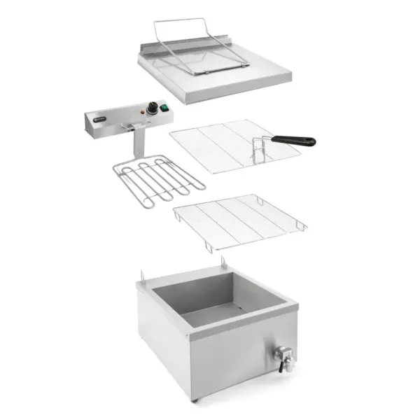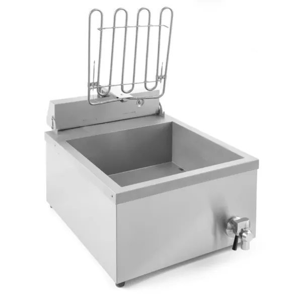 Fabricată din oțel inoxidabil de calitate superioară, friteuza este rezistentă la uzură și ușor de întreținut, menținând igiena și curățenia la cele mai înalte standarde profesionale. Grilajele incluse, cu dimensiunile de 354 x 383 mm, sunt echipate cu mânere rezistente la căldură pentru o manipulare ușoară și sigură. Capacul poate fi utilizat și ca tavă pentru picurare, contribuind la organizarea eficientă a spațiului de lucru. - Echipată cu Rezervor și Robinet de Scurgere