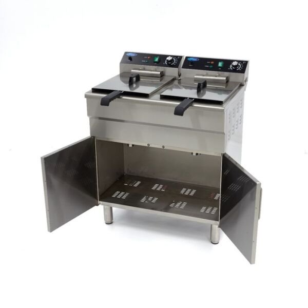Carcasa friteuzei este realizata integral din inox, oferind rezistenta excelenta la uzura si curatare usoara. Suportul metalic cu dulap dublu incorporat asigura o pozitionare ergonomica a echipamentului, astfel incat operatorul sa lucreze la inaltime optima si sa aiba la indemana spatiu de depozitare uscat pentru ulei, unelte sau alte consumabile.