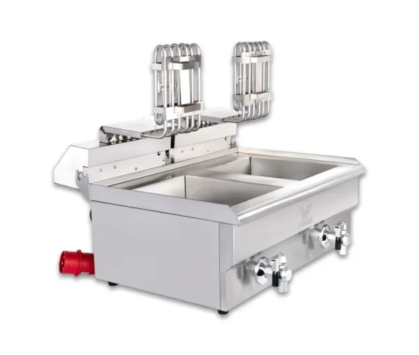 Un alt avantaj important este prezența robinetului de scurgere, care facilitează eliminarea uleiului uzat și curățarea cuvelor într-un mod rapid și eficient. Acest aspect este esențial pentru menținerea standardelor înalte de igienă în bucătăriile profesionale.