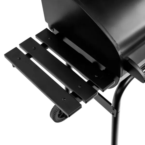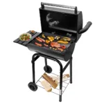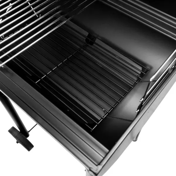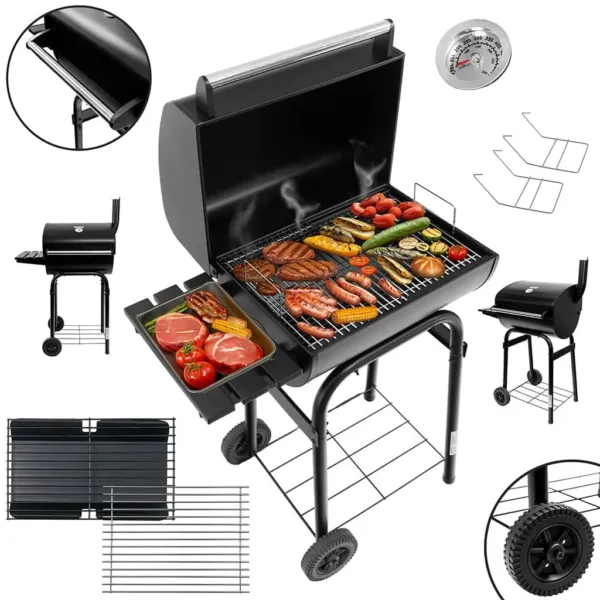Acest model, cu dimensiunile 78x53x122 cm, combina designul clasic al gratarelor pe carbune cu solutii moderne pentru eficienta maxima. Capacul prevazut cu termometru integrat asigura monitorizarea constanta a temperaturii, in timp ce cosul de fum si orificiile de ventilatie reglabile permit controlul precis al fluxului de aer. Blatul lateral si rafturile aditionale ofera spatiu practic pentru accesorii, condimente sau vase, optimizand procesul de gatit.