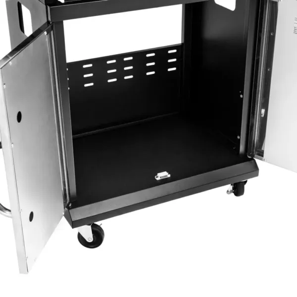 Blatul lateral extinde spatiul de lucru si ofera posibilitatea pregatirii ingredientelor sau depozitarii ustensilelor. Compartimentul inferior cu usa din inox permite organizarea buteliei de gaz si accesoriilor, mentinand o zona de lucru curata si ordonata. Gratarul este echipat cu patru roti, dintre care doua cu sistem de blocare, pentru o mobilitate excelenta si stabilitate maxima in timpul gatitului.