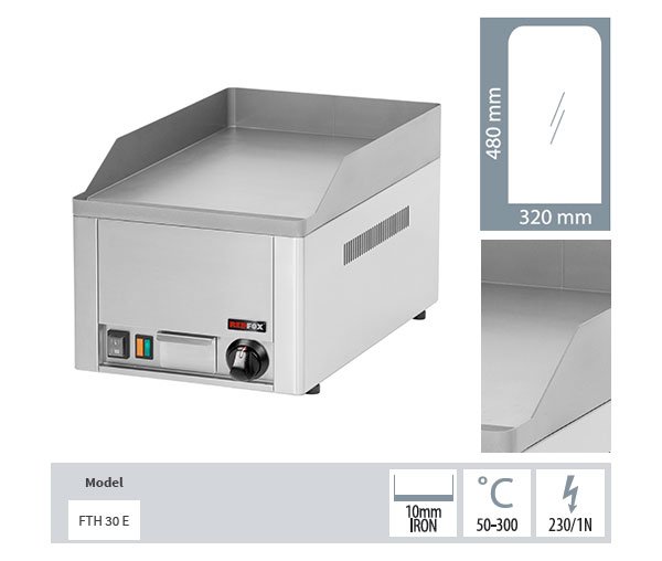 FTH30E este un grătar de banc, având dimensiuni exterioare de 330x540x220 mm și o greutate de 23,7 kg, ceea ce îl face ușor de integrat în orice spațiu de lucru profesional, chiar și în unități cu suprafețe mai mici. Fabricat din oțel inoxidabil AISI 304, acest grătar profesional electric oferă o durabilitate deosebită, fiind rezistent la uzura zilnică și la condițiile de utilizare intensă.