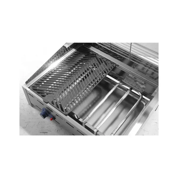 Un alt aspect important este grătarul de fontă emailată și tava de scurgere GN 2/1 detasabilă, care facilitează curățarea rapidă și eficientă a echipamentului. Datorită arzătoarelor detașabile și a panoului anti-vânt din oțel inoxidabil, grătarul devine ușor de întreținut și asigură o utilizare pe termen lung, fără probleme.